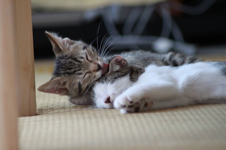 ぐっすり寝ている小町にじゃれかかるチッチ(源五郎)