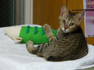 保護猫用に購入した移動可能大型ゲージの上で。魚ぬいぐるみであそぶアビ柄ちゃん。