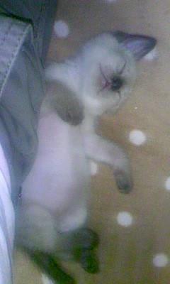 午前中、部屋の遮光と扇風機と保冷剤を寝床に敷いて仕事に出たのですが、気になって帰ってみると、寝床には居なくて、ベッドの隙間から出てきた・・・そらも暑かったのかハアハアと息をしていたので、熱中症になるかもと、すぐにエアコンにしましたが、前のシャムの子猫は大丈夫だったのですが、やはり少し小さいし、この子は体が弱いのかも…と思いました。