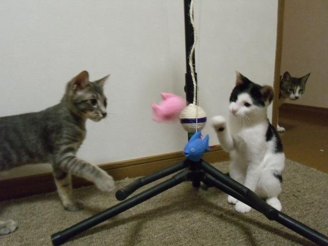 キャットタワーも楽しんでいるし、ご飯もみんな揃って食べた方が楽しいみたいで、みゃーと鳴いてご飯の催促したり警戒心がなくなってきたみたい♪