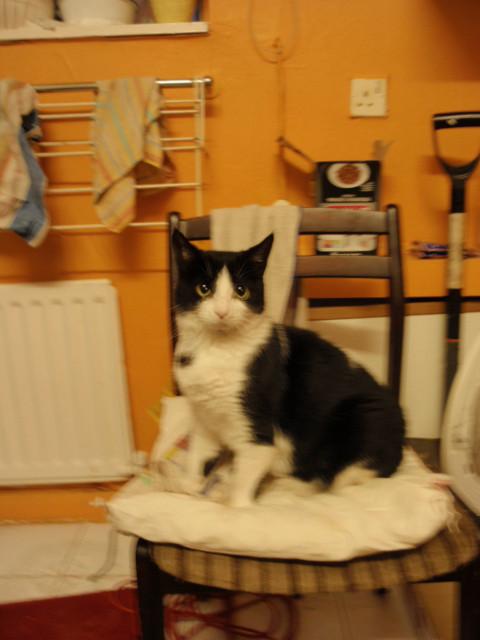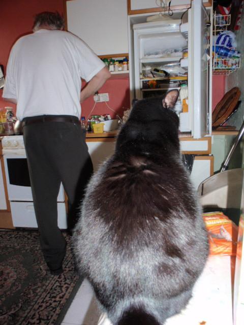 そして毎朝11時と16時は白身魚の時間。その時間になるとみんにゃわらわらとキッチンに集まります。こちらは義父が魚を茹でているのをじっと待つブラッキーの背中です(しかも思いっきりテーブル上にいます)♪