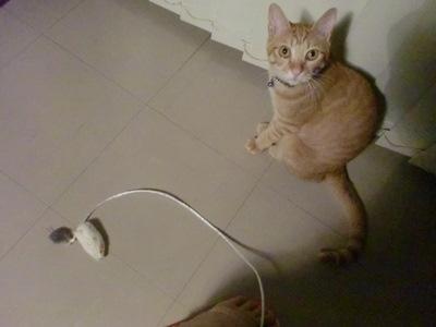 ネズミのおもちゃを紐の先に付けた物を部屋履きのサンダルに結んだだけの簡単な物ですが、私が歩く度にネズミも動くのでなかなか楽しそう。