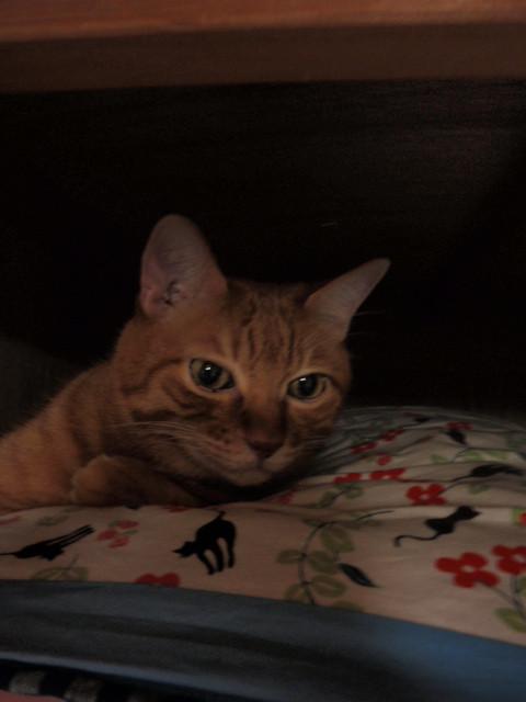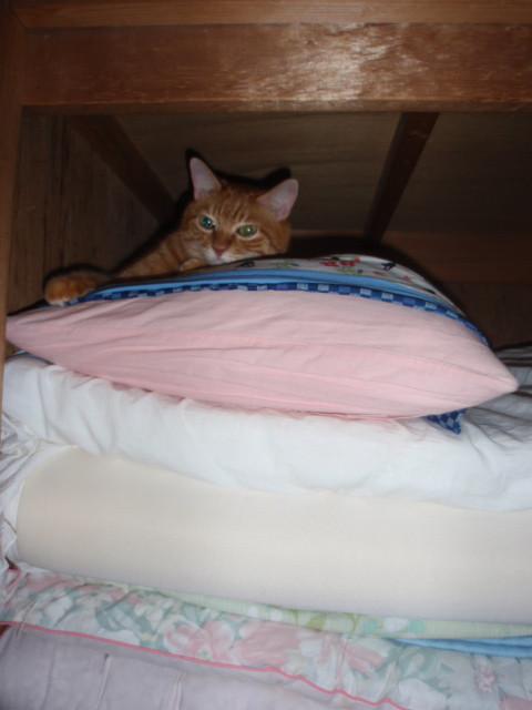 こちらは押入れの中にキャットタワーから飛び乗り、はなのお気に入りの場所をゲットしたようです。