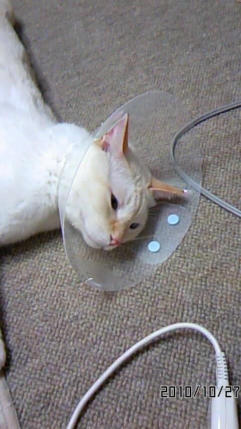 エリザベスカラーを付けていますが、大変にご機嫌斜めです。