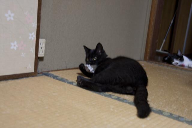 拾われたかな。幸せになってるかなぁなんて家族と話してたんですが、最後に残った黒猫1匹。気が付いたら、玄関横の棚に完全に住み込んでた。