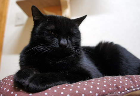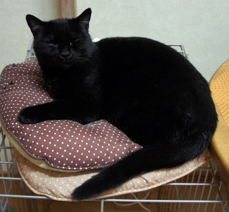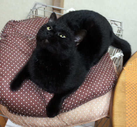 ・家に来てすぐでも、私から逃げる事はあまり無く、指をクンクン嗅いで来たり・ごはんをねだったり・トイレ掃除を覗きに来たり、と適応能力を発揮!最近はクッションの上がお気に入りで、私が居ても気にせず寝てます。