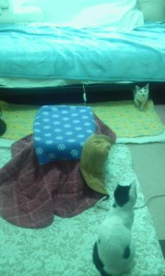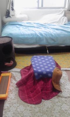 お恥ずかしながら、これがニャンズルームでして、奥のベッド(本当はわ私のベッド、今は隣の部屋使用中の私)の上から飛んで下の猫コタツに乗ったり、2匹で上下に分かれて、とびまくり!