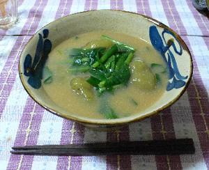 味噌汁の中に薩摩芋で作ったもちと、ニラが入ったもの・・・・スイトンのような食感です。