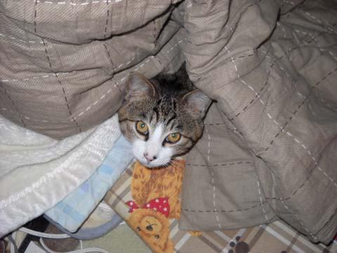 コタツから顔を出しているサバ吉です。