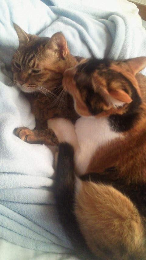 りんとみうですが最近寒くなって来たせいか 布団に潜ってきます。りんは腕枕で みうは腹枕で寝るようになりました。相変わらずラブラブですよ。