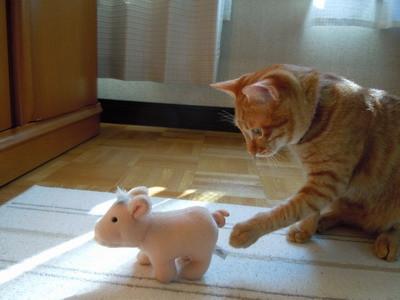 豚さんの尻尾が気になるみたい。。。「お前エライ短い尻尾だなぁ~」