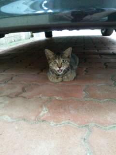 **** 車の下で警戒しているまもる君