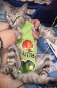 コスモスはエリザベスカラーが可哀想と術後服にしたら次から次へと脱ぎまくっています。