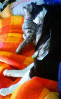 私の足の上でZZZ・・・私が寝るから動かしたら、丑三つ時の運動会が始まり・・・ドッタン、バッタン、ガリガリ・・・静かになったと思ったら私の横でZZZ・・・お前らー!と思いながら時計を見ると5時でした。