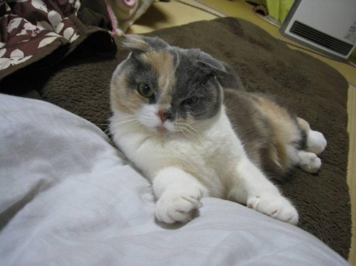 薄いグレー、黄土色、白のカラーがもなかの毛の色です。