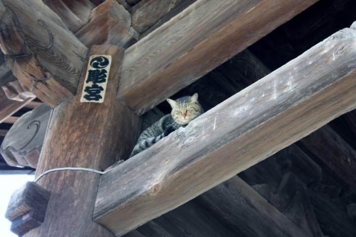 山門の柱を登って降りられなくなっていました。