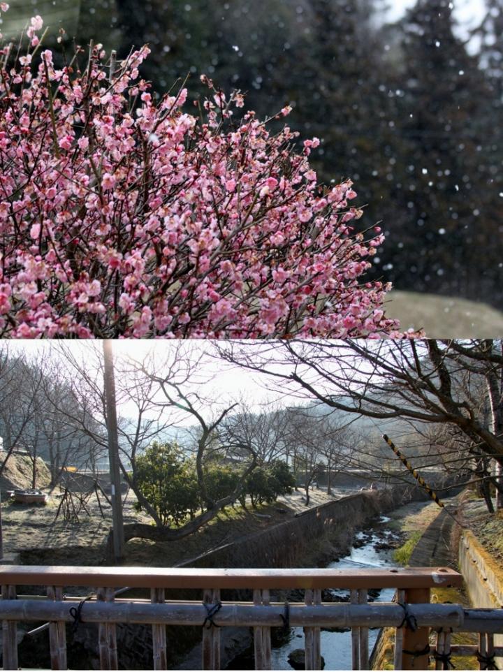 写真は、宿から見た梅の花と雪景色と朝霜を撮ったものです。(ポッチで大きく見れます)