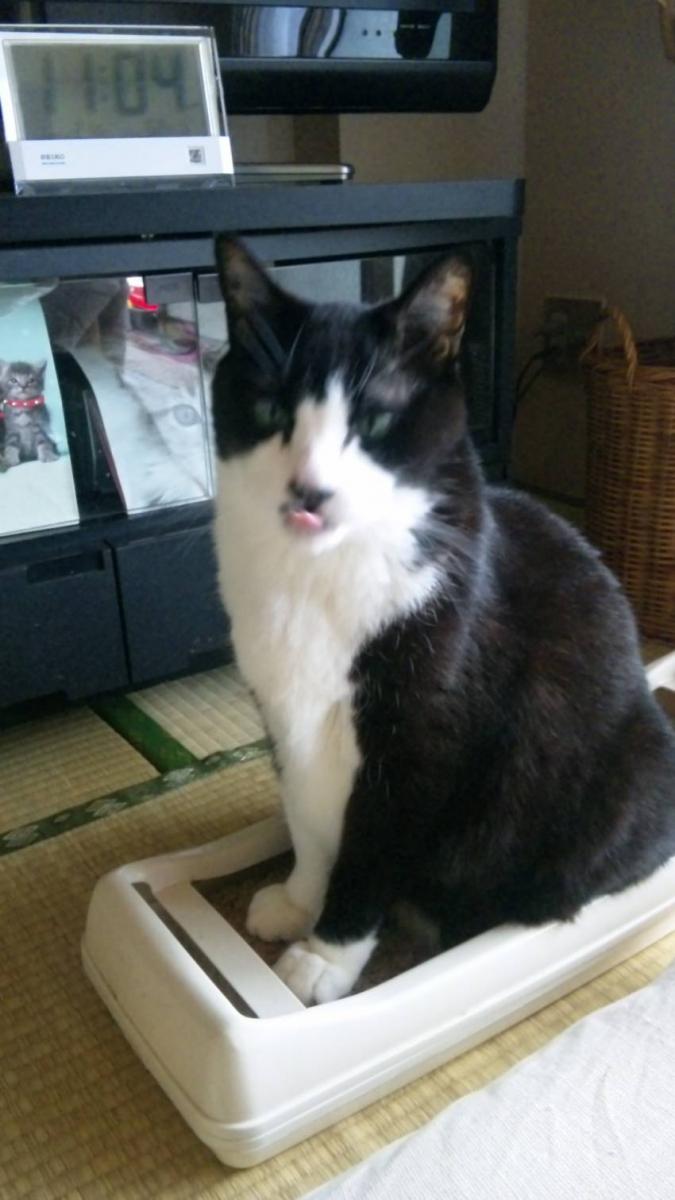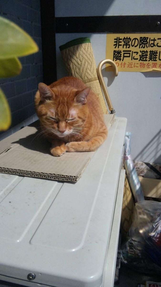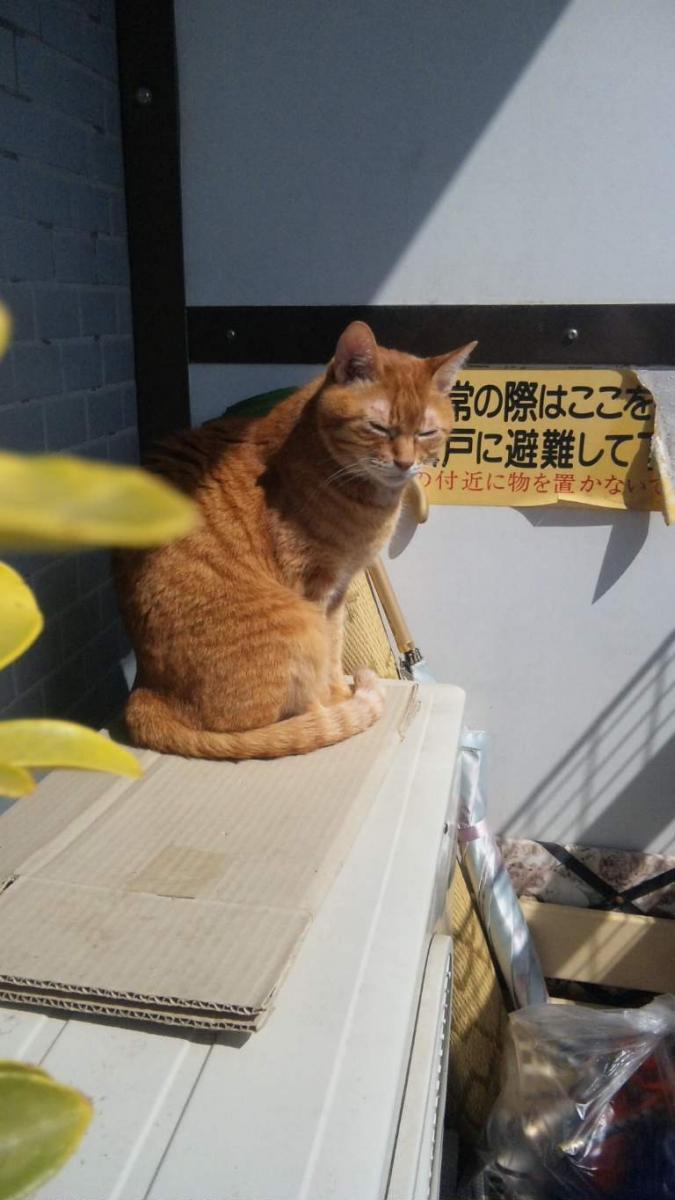 こちらはレオ。お気に入りの室外機の上で(段ボールをひいてレオ用の特等席になってます)