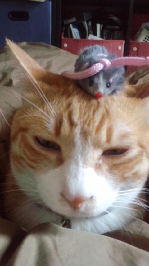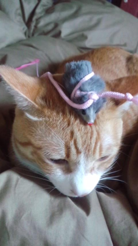 ねずみのおもちゃを頭に載せられたグゥ。