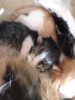一匹だけ、黒い仔猫が目が開いてきました。ほかはぎゅーっとつむってます。