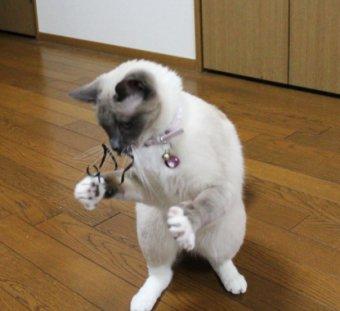 写真はヒモ遊びに夢中で立ち上がってしまったシャラです。