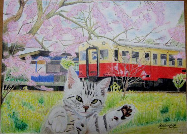 桜が満開の時期、小湊鉄道の飯給(いたぶ)駅に電車が入ってくるシーンです。