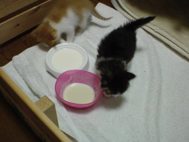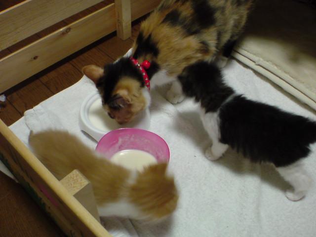 ミルクはミッケが飲んでましたが、仔猫は臭ってみるだけでした。