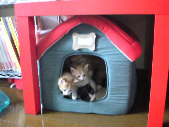 入れたら入るけど、ちょっとするとすぐ出てきちゃって、家の脇に全員で固まっちゃう。何でそんなところに引っ越したのか良くわからないけど、住み慣れたベット下を出て、変なスキマに身を寄せるジプシーたちです。