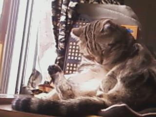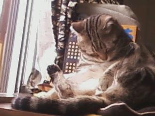 この体勢のまま約15分程居眠り、毛づくろいを再開するも、また居眠り、結局、毛づくろいを諦めたのか、自分の背中の上に移動し、そのまま本格的に昼寝開始。