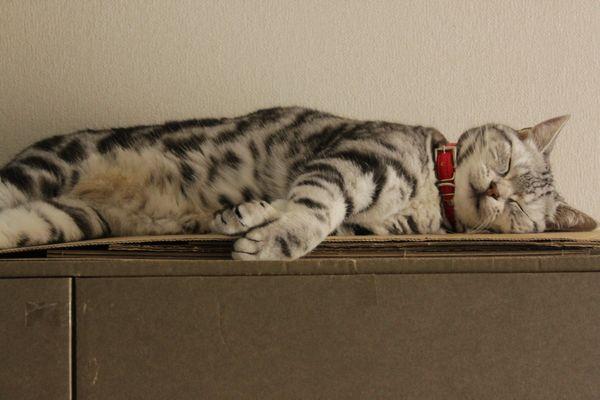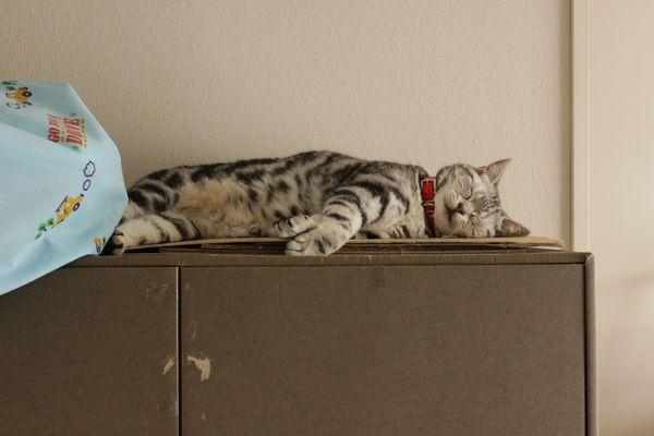 様子を見に行ってみると、タンスの箱の上で寝ていました。
