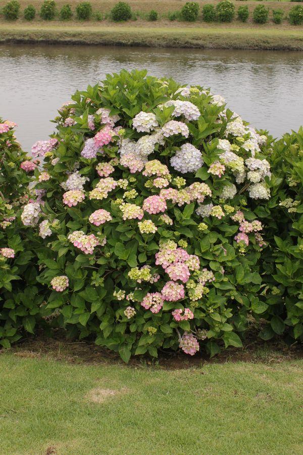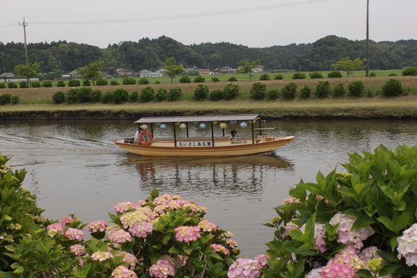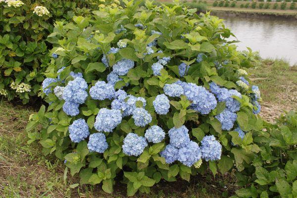 のどかな田園風景の中に川が流れていて、両岸にアジサイの花がたくさん咲いていました。