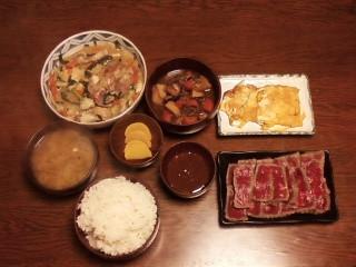 牛のたたき、玉子焼き、ジャガイモと玉葱の味噌汁、蛸じゃが、漬物、塩豚と野菜の味噌炒め