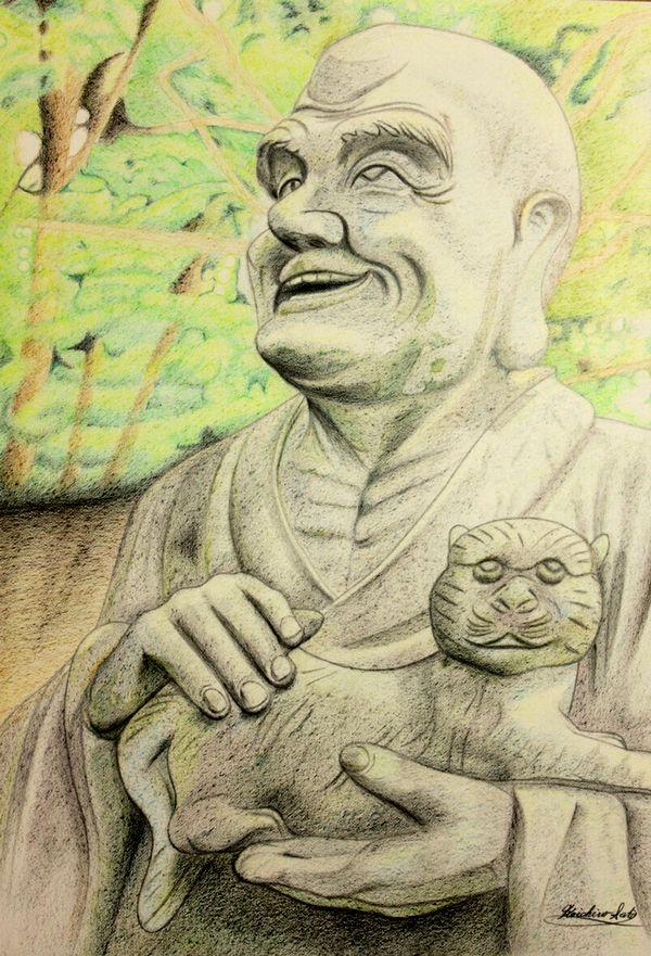 羅観様の穏やかな表情と抱かれた猫を見て、「祈りと安らぎ」というタイトルで絵を描きました。