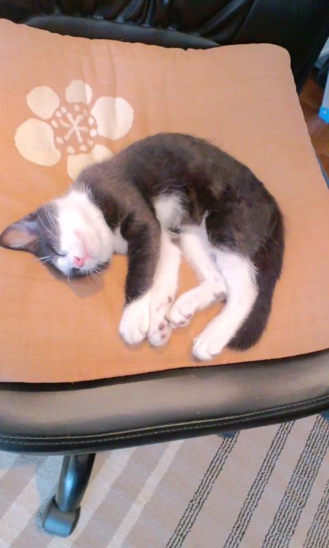 なぜか仕事場の私のイスが寝心地いいらしくここではよく寝てくれます。それでも時々目を開けて私がちゃんといるか確かめます。