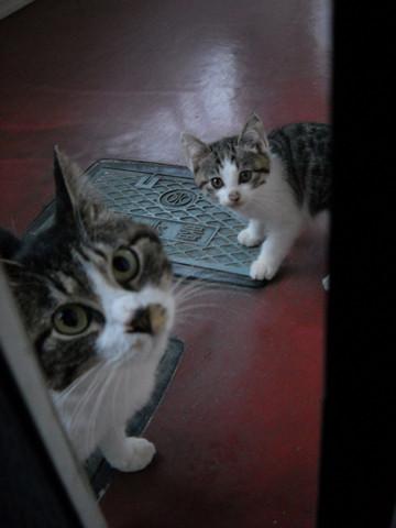 サバ吉の兄弟だと思われていた子は実は女の子で、しかも先週末から子ネコをつれて早朝にご飯を食べに来るようになりました。