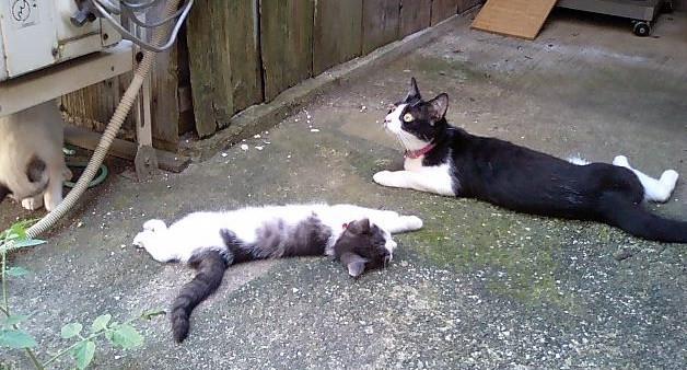 大きいしずくは、とても怖がってましたが、最近暑さのせいか、家の裏のうさぎ小屋のそばで、親子3匹でよく寝ていました。