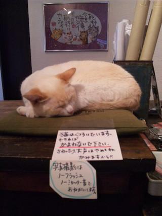 店内レジ横にぐっすり眠っているまさしく招き猫(^-^)白猫???いや少し茶がかったゴールドの様な不思議な色。店員さんも「珍しいでしょ~」とおっしゃていました。