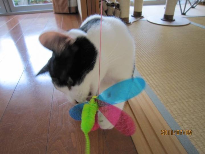 ただ、これ、にゃんこがくわえてると、羽が口からはみ出しててホントの虫みたい…(@_@;)