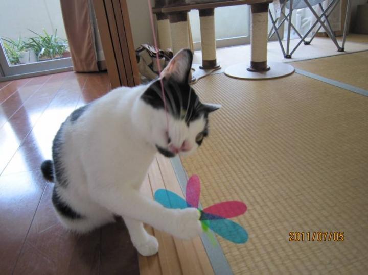 羽がカシャカシャ音がするのが気に入ったのか、私が持つと寝ててもすっ飛んで来ます(=^・^=)