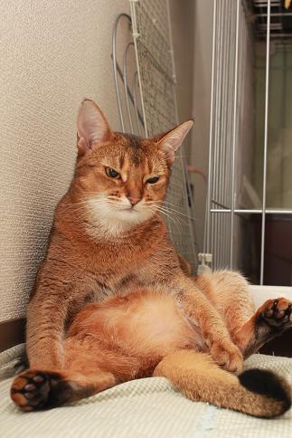毛づくろい中はこの状態…お腹に鎮座するポニョが邪魔で、なかなか