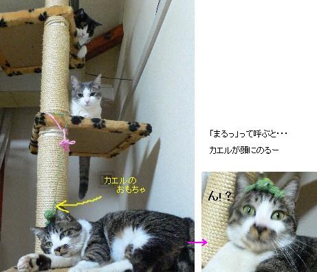頭にオモチャのカエル乗せたり、さっきもキャットタワーからズリ落ちて目が点になってたし・・・><