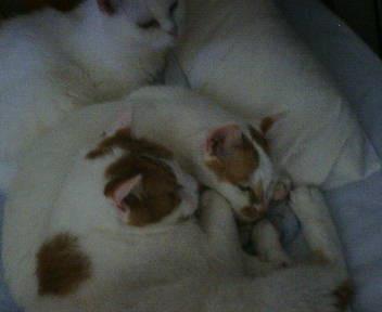 ひとつの枕に人間+3匹のニャン!