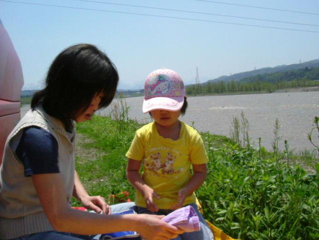 今日はとても天気が良く、しかも熱い!!せっかくなので田植えが終わってから娘とチコママと外でランチです。仕事の後に外で飲むビール!やっぱりやめられませんねー。近くを流れる信濃川の土手で食べました。