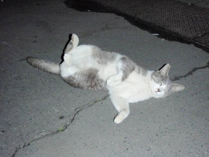 遊び疲れてゴロン、ヘソ天パカッと開きのポーズ