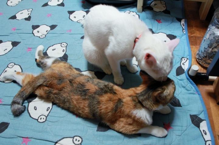 腹這いの「ゆめ」に ちょっかいを掛ける「らん」