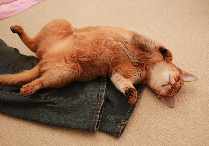 脱ぎたての服やジーンズの上にちょこんと座り込み、片付けることができず…