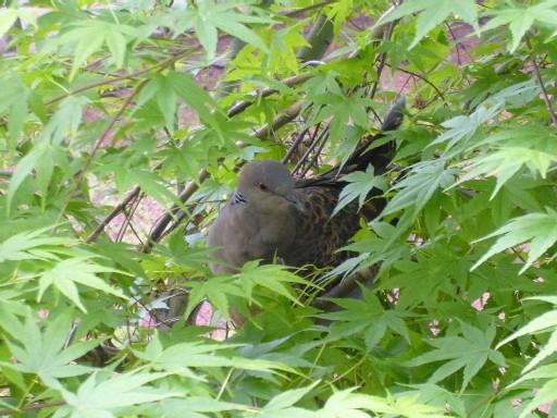 社宅の庭にあるもみじの木に山鳩が巣作りはじめました・・・
