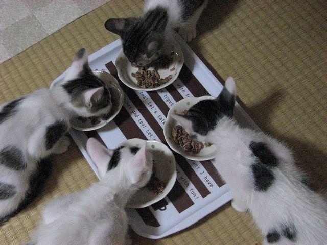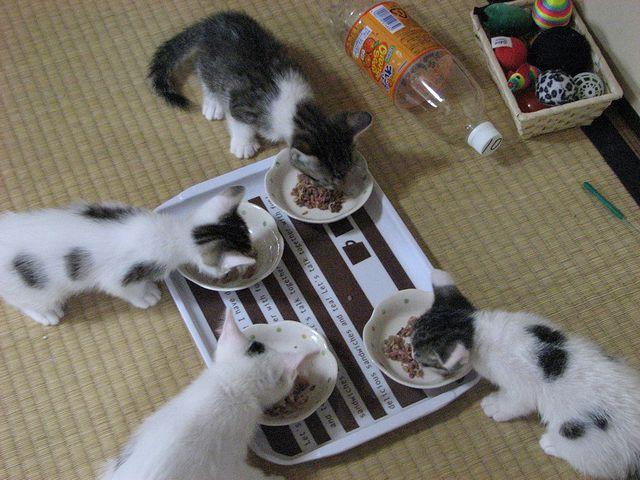 生後8週間くらいから、子猫用のドライそのままにウェットを混ぜたものなら、