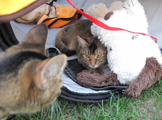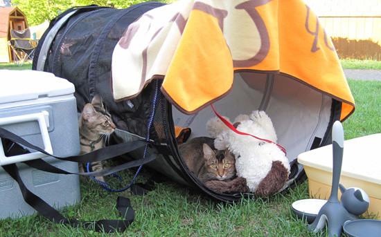 夜はバンガローを借りて犬は車内、猫は簡易ゲージ。