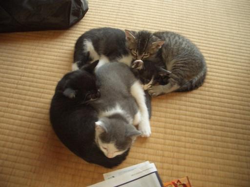 最後の分かれの朝、残った4匹でちょいとかたまって居眠りモード。